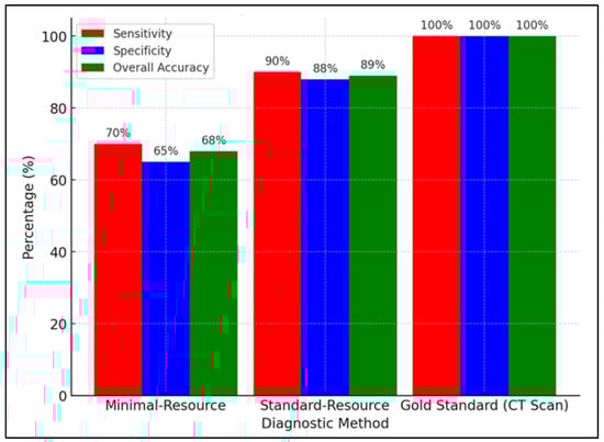 Comparison of sensitivity, specificity, and overall accuracy between minimal-resource, standard-resource, and gold-standard (CT scan) methods.