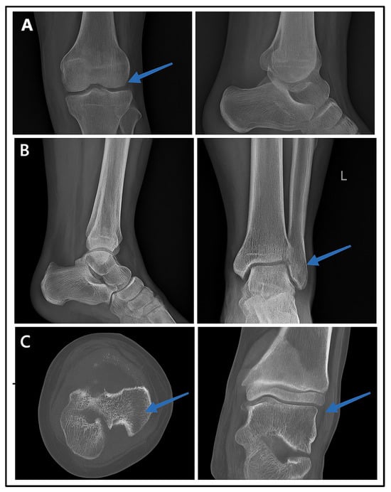 Radiographic images of fractures using minimal-resource (A), standard-resource (B), and gold-standard methods with CT scans (C). Blue arrows indicate the fracture site.