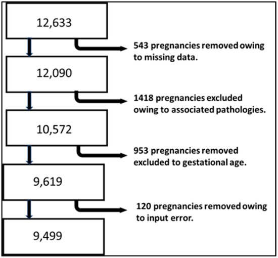We began with a study population of 12,633 pregnancies. After applying the exclusion criteria and removing pregnancies with missing data or input errors, we were left with 9499 pregnancies (Figure 1).