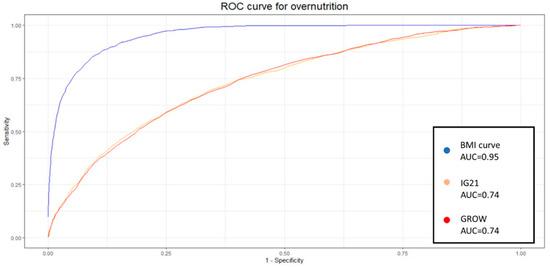 This difference was confirmed by the DeLong test. Similarly, the aucROC for determining overnutrition using the BMI curve was higher (0.95 vs. 0.74–0.74), as demonstrated in Figure 3, and this result was also confirmed by the DeLong test.