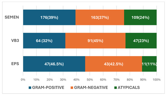 The pathogens isolated in VB3, EPS, and seminal fluid are described in Figure 1. In VB3, 91 were Gram-negative (45%), 64 were Gram-positive (32%), and 47 were atypical pathogens (23%) (total 202). In seminal fluid, 163 were Gram-negative (37%), 176 were Gram-positive (39%), and were 109 atypical (24%) (total 448). In EPS, 43 were Gram-negative (42.5%), 47 were Gram-positive (46.5%), and 11 were atypical (11%) (total 101).