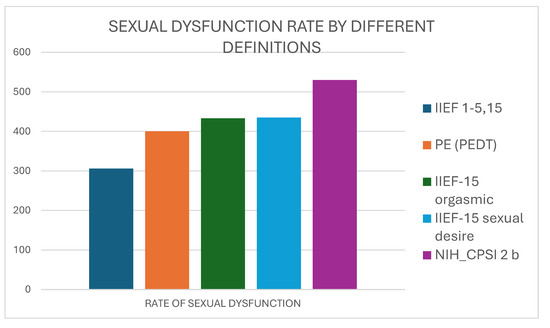 The increasing rate of sexual dysfunction by considering IIEF score for erectile dysfunction (IIEF 1–5,15) alone or together with premature ejaculation rate, IIEF-15 scores for orgasmic function or desire, and NIH-CPSI reply to question 2b for ejaculatory pain.
