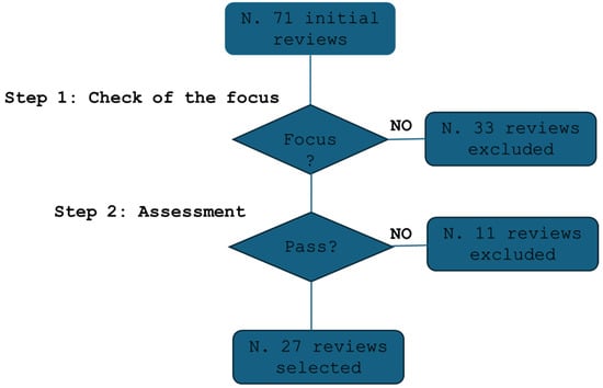 Figure 1 illustrates that the initial search yielded a total of 71 reviews. From these, 33 studies were excluded due to their lack of direct focus. Following the evaluation according to the methodology described above, 27 review studies were retained [11,12,13,14,15,16,17,18,19,20,21,22,23,24,25,26,27,28,29,30,31,32,33,34,35,36,37] for further consideration, while 11 studies were excluded.