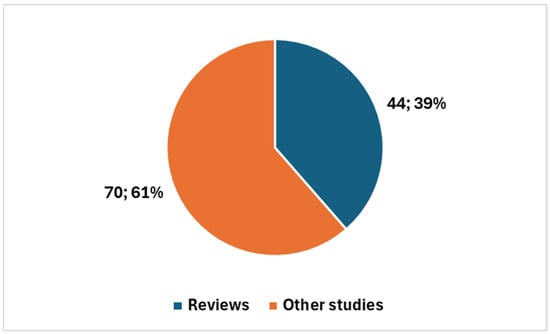 When analyzing the nature and composition of these AI-related studies, an interesting pattern emerges. Of the 114 total publications, 44 are review articles, while the remaining 70 studies consist of primary research articles (Figure 3). This distribution indicates that a significant proportion of AI research in interventional radiology is dedicated to synthesizing existing knowledge, evaluating trends, and identifying future directions. Notably, the majority of these reviews are very recent; 42 out of 44 (95.5%) have been published within the last five years. This suggests an ongoing effort by the scientific community to assess the rapid advancements in AI and its implications for clinical practice. The predominance of recent reviews also highlights the field’s current stage of development, where researchers are still working to consolidate knowledge, establish best practices, and address key challenges such as regulatory considerations, clinical validation, and real-world integration.