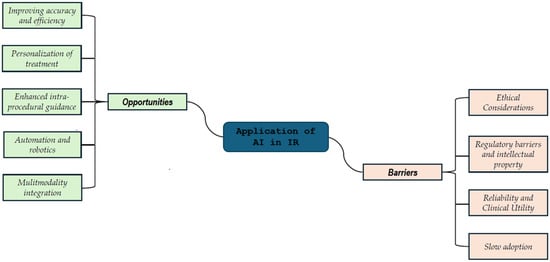 AI acts as a mediator [10], assisting in image analysis, optimizing procedural planning, and improving real-time decision-making. Robot-assisted interventions increase accuracy, reducing human error and enabling remote procedures. AR and VR technologies offer immersive training environments and real-time guidance during complex interventions, allowing for more precise catheter navigation and treatment delivery. As these innovations continue to evolve, interventional radiology is set to become even more adaptive, personalized, and minimally invasive, with AI playing a significant role. However, this integration introduces challenges and ongoing needs that must be monitored closely to ensure its successful implementation and optimal impact on patient care [9,10].