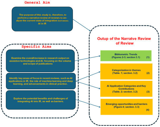 It is therefore important to analyze both the evolution of the integration between AI and interventional radiology (IR) as well as the ongoing implications and challenges. An overview of the published reviews allows us to bring this out in a comprehensive manner. The general aim of this study is, therefore, to provide a narrative review of reviews (NRR) with the purpose of analyzing the state of integration of AI with interventional radiology, with the following specific objectives: