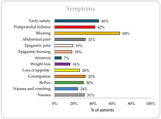 The study included 3689 patients with a mean age of 43.18 years. Diabetic patients (n = 714) were significantly older than non-diabetics (56 vs. 40 years, p < 0.0001). Gender distribution, detailed in Table 1, showed a slightly higher proportion of males (55%) overall. The most commonly reported symptoms (Figure 1) were bloating (68%), early satiety (46%), and postprandial fullness (42%). Diabetic patients had a higher prevalence of early satiety (56% vs. 45%, p < 0.0001), bloating (73% vs. 67%, p = 0.0015), reflux (28% vs. 24%, p = 0.029), and constipation (35% vs. 30%, p = 0.006), while non-diabetics reported more epigastric pain (20% vs. 13%, p = 0.0003).