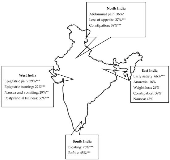 Regional variation in upper gastrointestinal symptoms in India. Only significant values are represented: * p < 0.05, ** p < 0.01, *** p < 0.0001 calculated using Chi-square test.