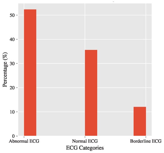 Frequency distribution of ECG diagnosis categories in the dataset ‘DIAGNOSIS’ column, illustrating the proportion of samples classified as ‘Abnormal ECG’, ‘Normal ECG’, and ‘Borderline ECG’. The chart highlights a significant class imbalance, with ‘Abnormal ECG’ constituting the majority of the dataset, emphasizing the challenges this imbalance poses for effective model training and classification.