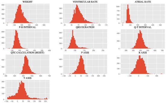 Distribution of ECG-related numerical features before preprocessing, including clinical parameters such as weight, ventricular rate, atrial rate, P-R interval, QRS duration, Q-T interval, and axes (P, R, T). Most features exhibit a Gaussian distribution, while others display long right-tailed distributions. These visualizations guided preprocessing steps, such as outlier analysis and standardization, to optimize the dataset for machine learning model training.