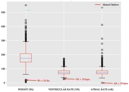 Boxplots of selected numerical features (weight, ventricular rate, and atrial rate) illustrating the results of outlier analysis. The analysis highlights the presence of extreme and unrealistic outliers, such as weights below 50 lbs, ventricular rates below 30 bpm, and atrial rates below 50 bpm. These outliers likely result from errors during the data collection process. The findings informed preprocessing steps, which included the removal of implausible values to improve data quality and model performance.