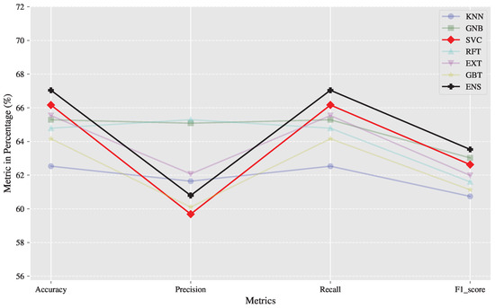 Classifiers based on different priors are considered, e.g., tree-based, gradient-based, etc., to enable various exploration of the unknown dataset hypothesis. All classification models trained are as follows: K-nearest neighbor (KNN), Gaussian Naive Bayes (GNB) [18], support vector machine (SVM) [19], random forest (RFT) [20], extremely randomized trees (EXT) [21], and gradient boosted trees (GBT) [22], Finally, an ensemble of the top 4 fine-tuned weak learners (ENS) is used, leveraging a meta-learning approach. This ensemble predicts classes using a soft-voting scheme that averages the predictions and confidence scores of the individual weak learners. Soft voting, in contrast to majority (hard) voting, helps handle ties in the overall predictions. Equation (3) represents the soft-voting mechanism, where the final prediction for a given diagnosis d is determined by selecting the class c that maximizes the weighted sum of probabilities predicted by each weak learner m, with weights . This approach incorporates the confidence of each model, making it more robust than hard voting.