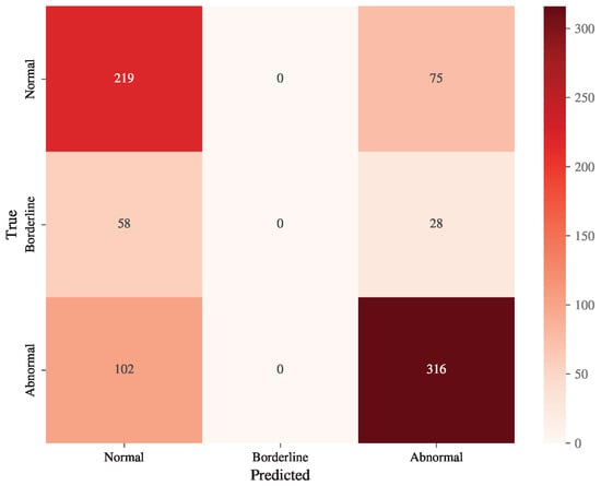 Figure 5 presents the confusion matrix for the EXT model’s predictions on the testing set. The matrix highlights the distribution of true versus predicted classes for normal, borderline, and abnormal ECG diagnoses.