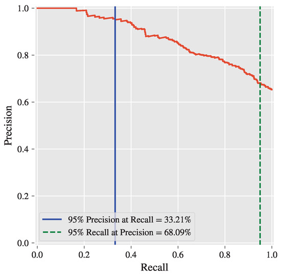 This conversion from multiclass to binary classification allows the model to have a precision–recall (PR) trade-off curve with a dynamic threshold, enabling the selection of a specific precision value along with its corresponding recall, and vice versa [26,27,28].