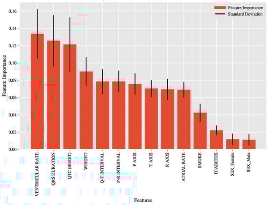 The bar heights represent the relative importance scores, indicating that features such as ventricular rate, QRS duration, and QTC (Bezet) are among the most influential in determining ECG classifications. The error bars illustrate the standard deviation of the importance scores across out-of-bag samples, reflecting variability in feature contributions.