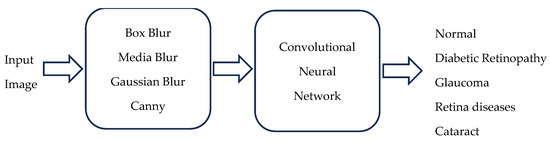 The input image is pre-processed to obtain a clear, noise-free image, and an edge detector is applied to enhance the characteristics of each disease. These features are fed into a convolutional neural network to classify eye diseases.