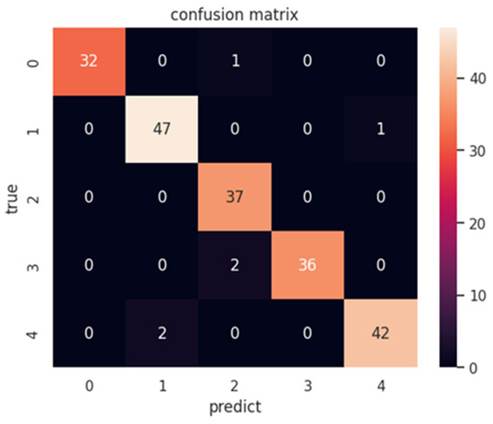 The confusion matrix shows us four cases in which the model fails in the classification. In one of the cases, it confuses class 0 with class 2. It also confuses class 0 with class 4, and there are cases in which it confuses two patterns of class 3 with class 2 and misclassifies class 4 and confuses it with class 1.