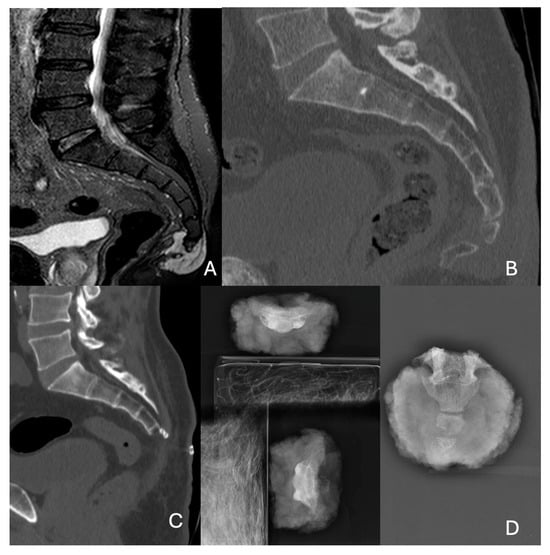Preoperative MRI (A) and preoperative CT scan (B) of S4 chordoma. Postoperative CT scan after midline resection at S4 level (C). X-ray of the anatomical surgical specimen (D).