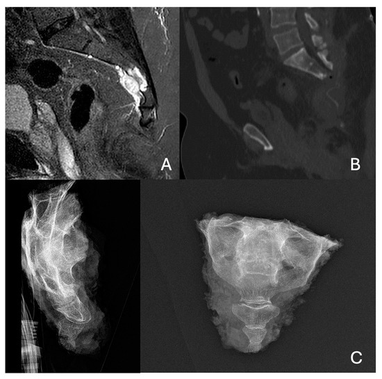 Preoperative MRI (A) and preoperative CT scan (B) of mid-sacral chordoma. X-ray of the anatomical surgical specimen (C).