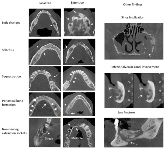 - Yfanti, Z.; Tetradis, S.; Nikitakis, N.G.; Alexiou, K.E.; Makris, N.; Angelopoulos, C.; Tsiklakis, K. Radiologic findings of osteonecrosis, osteoradionecrosis, osteomyelitis and jaw metastatic disease with cone beam CT. Eur. J. Radiol. 2023, 165, 110916. [Google Scholar]