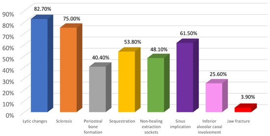 Figure 3 presents the distribution of all the radiologic features for MRONJ-affected jaws.