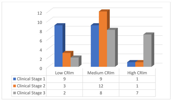 Figure 4 shows the distribution of the CRIm classifications in three groups, according to the clinical stage.