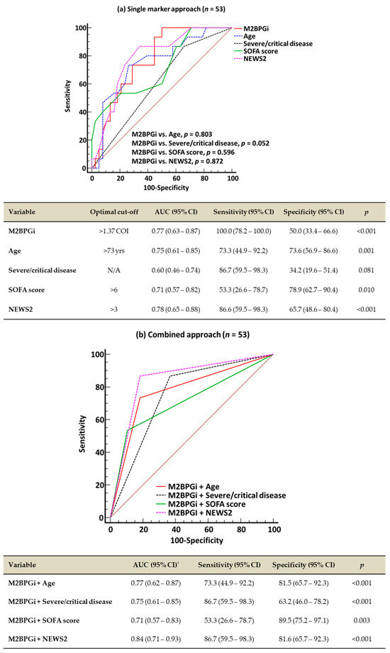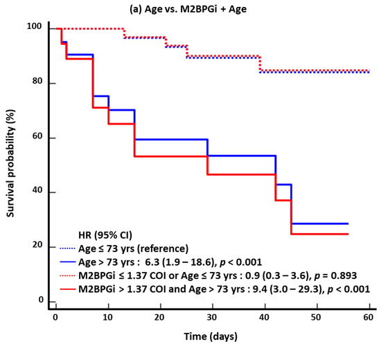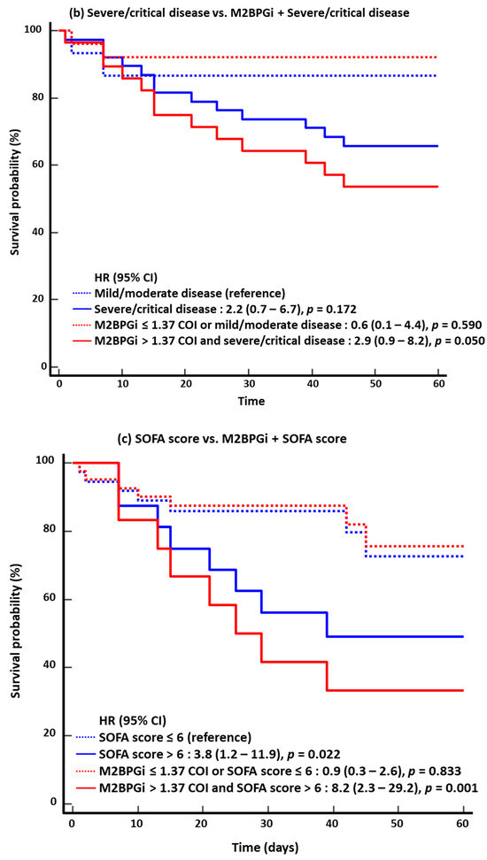 Kaplan–Meier (KM) survival analysis was used to calculate the hazard ratio (HR) with 95% confidence interval (CI) of the single-marker and combined approaches for 30-day mortality and 60-day mortality. The sample size for the KM survival analysis was estimated using log-minus-log transformation, which was suggested for improving the accuracy of the small sample size [28]. The inputs, except for the alternative survival probability, were identical to those mentioned in our previous studies [8,9]. The alternative survival probabilities were set to S1 (t) = 0.226 for 30-day mortality and S1 (t) = 0.283 for 60-day mortality based on the 30-day mortality and 60-day mortality in this study. The sample size for 30-day mortality or 60-day mortality ranged from 9 to 16 with actual power > 0.8 [28]. Accordingly, the sample size of 53 was considered sufficient to perform the KM survival analysis [8,9,22]. No death in the M2BPGi control group (M2BPGi ≤ 1.37 COI) caused the phenomenon of monotone likelihood resulting in the infinite HR of M2BPGi > 1.37 COI for both 30-day and 60-day mortality (Figure S1). We did not report the data based on the previous study, which stated that the infinite HR was not considered reliable [29]. Univariate and multivariate Cox proportional hazard (PH) regression analyses were performed to determine the effect of age, male sex, numbers of comorbidities, disease severity, SOFA score, NEWS2, and M2BPGi on the 30-day mortality and 60-day mortality. MedCalc Software (version 23.0.9, MedCalc Software, Ostend, Belgium) was used for statistical analysis, and p < 0.05 was considered statistically significant.