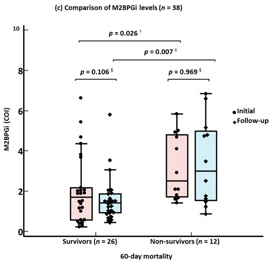 Table 2 shows the comparison of clinical variables and M2BPGi levels according to the mortality. The age and the proportion of the older age group (age ≥ 70 years and ≥75 years) differed significantly according to the 30-day mortality and 60-day mortality (all p < 0.05). The SOFA score, NEWS2, and M2BPGi levels, and the proportion of M2BPGi levels > 1.37 COI differed significantly according to the 30-day and 60-day mortality, except for the proportion of severe/critical disease (all p < 0.05).