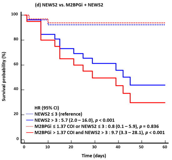 Kaplan–Meier survival analysis for 60-day mortality (n = 53). (a) Age vs. M2BPGi + Age. (b) Severe/critical disease vs. M2BPGi + Severe/critical disease. (c) SOFA score vs. M2BPGi + SOFA score. (d) NEWS2 vs. M2BPGi + NEWS2. Abbreviations: see Figure 1; HR, hazard ratio.