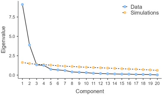 The sample adequacy was tested using the Kaiser–Meyer–Olkin (KMO) method, yielding a value of 0.903, confirming that the sample meets basic conditions for conducting EFA. For sample adequacy assessment for each variable, the “anti-image” option (available in SPSS, version 22 (IBM Corp., Armonk, NY, USA)) was used, showing diagonal values greater than 0.90 for 12 items (4, 5, 6, 7, 10, 14, 15, 16, 17, 18, 19, 20), values above 0.60 for three items (8, 9, 11), values above 0.70 for three items (1, 2, 13), and values above 0.30 for one item (3). These values indicate good sample adequacy for most variables.