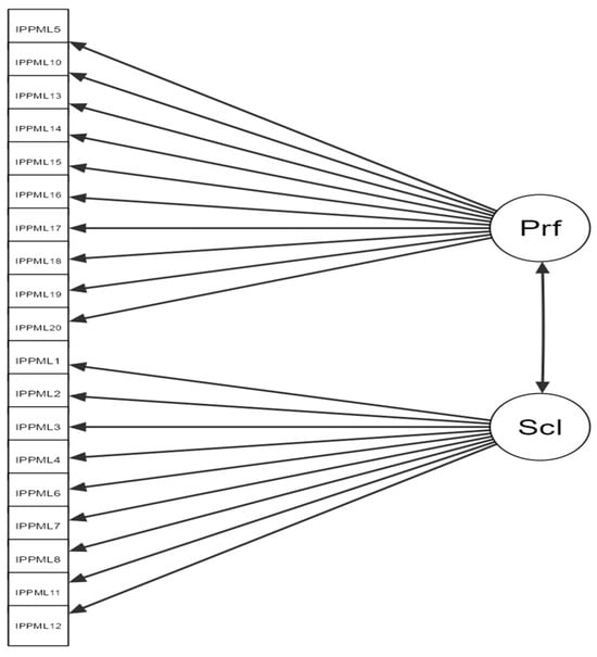 Path diagram of the two-factor (Performance and Social) model for the IPPML.