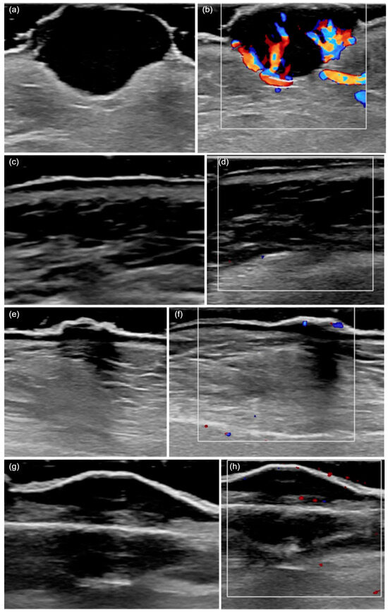HFUS (20 MHz) features of cutaneous squamous cell carcinoma. (a) A hypoechoic lesion with an irregular shape and heterogeneous echogenicity, invading the deep dermis and presenting ulceration. (b) The color Doppler mode shows a marked increase in local vascularization. (c) A hypoechoic tumor confined to the epidermis, with a regular shape and homogeneous echogenicity. (d) An absence of local vascularization in color Doppler mode. (e) The presence of posterior acoustic shadowing. (f) Moderate vascularization detected in color Doppler mode. (g) A hypoechoic, regular, and poorly defined lesion invading the hypodermis, with posterior acoustic shadowing. (h) The presence of vascularization in color Doppler mode.