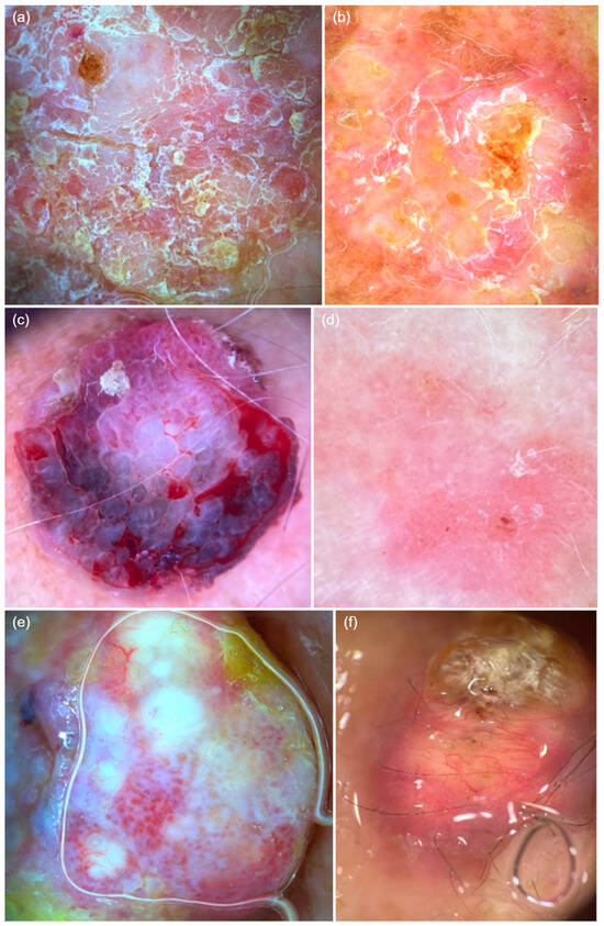 Dermatoscopic features of cutaneous squamous cell carcinoma. (a) Glomerular vessels, diffusely distributed mixed scaling, white halos surrounding vessels, erosions, and white structureless areas. (b) Punctate vessels on a background erythema, diffuse white scaling, and erosions. (c) Polymorphic vessels, including glomerular, serpentine, and linear vessels, along with ulceration, bleeding, and blood spots. (d) Punctate vessels on a background erythema with discrete white scaling, white halos surrounding vessels, and white and wide follicles, with central erosion. (e) Polymorphic vessels, including glomerular, linear hairpin, and arborizing vessels, along with white structureless areas and white halos surrounding vessels. (f) Whitish keratin deposits, polymorphic vessels, including linear hairpin and serpentine vessels.