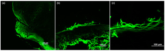 Using FCM, 24 cSCCs were analyzed. Part of the tumor tissue was fixed in Tissue-Tek O.C.T and frozen at −80 degrees Celsius for 30 min. In order to be analyzed under an FCM, the tumors were sectioned with a cryotome with a thickness of 5 microns and applied to microscopy slides (4 sections per slide). The slides were shipped to a confocal microscopy center for analysis in refrigerated containers. Without the use of special staining, the analysis was carried out on native sections.