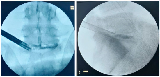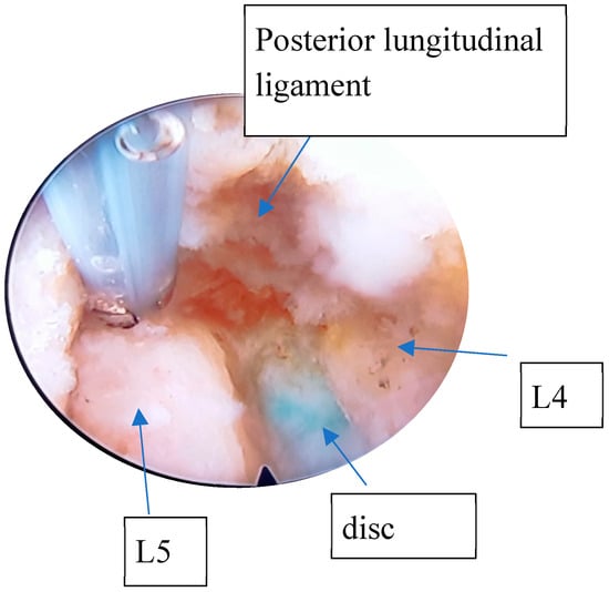 General intravenous anesthesia (GIVA) was routinely used. The exceptions were patients whose general condition contraindicated GIVA; they were sedated with local spinal anesthesia for lumbar fixation. Patients were positioned prone on a radiolucent bed, with special supports at the level of the iliac crests and chest (Figure 2). A C-arm fluoroscopy machine was used. The arms were abducted and placed on padded boards, and the legs were kept in extension. A standard dose of Cefazolin 2 g was administered intravenously before the skin incision. The role of C-arm fluoroscopy is crucial at this phase. The surgical procedure can be started only after obtaining a perfect anteroposterior and lateral image of the vertebral level. This particular step of the procedure required a standardization procedure through instructions on the positioning and mobilization of the device, as the radiology staff in charge of the operating room had no experience regarding endoscopic spinal surgery procedures. The needle entry point was selected 8–12 cm from the midline, situated just above the facet joint on the lateral view. A 22-gauge needle was inserted into the disc, followed by the injection of contrast medium (7 mL of iohexol with 3 mL of methylene blue) into the disc. The correct setting of the entry points represents a key step in the entire procedure. A blunt tapered cannulated obturator was passed over the guide wire under fluoroscopic guidance. Sequential protective cannulas were introduced over the obturator until the final protective cannula was in position. Foraminoplasty was performed using a 10 mm diameter trephine via the transforaminal approach. The protective cannula was then replaced with an 8 mm working cannula. The endoscope (Endofest Luma) was positioned through a working casing pipe inserted through a 1 cm skin incision centred on a guidewire (Figure 2). The prominent intervertebral disc, stained with methylene blue, was removed using a pituitary rongeur under the endoscope (Figure 3). Next, the hypertrophied ligamentum flavum, facet joints, and anterior herniated disc were resected to achieve decompression. Epidural bleeding was controlled with a radiofrequency probe (Endofest Luma srl, Palermo, Italy) under physiological solution irrigation. Finally, the working cannula and endoscope were removed, and the skin was sutured.
