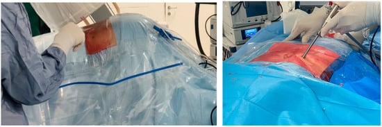 L5-S1 herniations represent approximately 40–50% of all herniated discs, although this value depends on the studies considered. Percutaneous endoscopic discectomy often presents a difficult challenge for the surgeon, especially those with less experience, due to anatomical considerations. The iliac wing frequently impedes optimal entry, risking the outcome of the operation, particularly in cases of downward-migrated hernias. We believe that correct patient positioning on the operating bed can facilitate this procedure, representing an essential parameter in the pre- and intra-operative management of the patient and an element whose standardization represents a necessity for the success of the surgical procedure. In all cases considered for this study, patients with an L5-S1 hernia were positioned prone. Rolls of soft sheets approximately 5 cm thick were positioned under the chest and at the level of the iliac crests. Additional padding was placed at the level of the legs and feet to maintain them at approximately 30–40°. The iliac crest was positioned at the level of the folding point of the bed, and the lower limbs were bent by approximately 40–45°. Furthermore, the patient was positioned at a 20° Trendelenburg tilt. Subsequently, the patient was positioned with a lateral bend—lower limbs to the left if the endoscope entrance was on the right, and lower limbs to the right for entrances on the left. This position allows for a modification of the iliac wing height and the greater opening of the foramen, facilitating easier entry and contributing to better surgical outcomes. The choice of this positioning and the angle at which the entry takes place allows for a greater ease of handling in the surgical movement and guarantees the best safety profile in relation to the possibility of damaging the local vascular–nervous structures. The photos below describe this position. The techniques just discussed are well exemplified in the photos, which were acquired during some of the procedures of the patients in the study, subject to the granting of due consent and relative authorization for publication. The surgical technique proceeded as previously described. The operating room nursing staff were not selected on the basis of specific skills; we simply collaborated with staff with general training in OR routine. Even the radiological technicians present during the interventions did not have specific training but were trained progressively through pre- and post-operative briefings. The anesthesiologists in the room had no experience in assisting with this particular procedure before the start of the study, nor were they given specialized training.