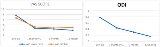 Of the 1000 patients enrolled in this study, their pre-operative ODI was 0.78. After one month, this value decreased to 0.44, at six months to 0.3, and after one year to 0.16 (Figure 5). In this case, there were no differences between the two sexes or based on the different endoscopies used. Again, no statistically significant differences were discerned based on the anthropometric or clinical parameters examined. Among the 434 patients surgically treated for the L5-S1 segment, the pre-operative VAS score was 8.1 at the lower limb level and 7.3 at the lumbar level. After one month, the VAS score dropped drastically to 3.4 for the lower limbs and 3.7 for the lumbar region. At six months, the scores were 2.2 and 2.5, respectively, and at twelve months, they were 1.8 for the lower limbs and 2.8 for the lumbar region.