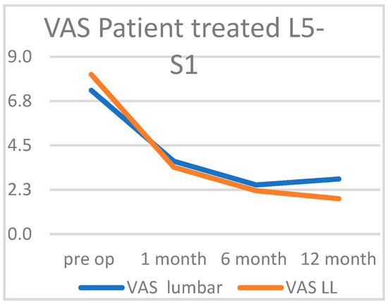 Of the 1000 patients enrolled in this study, the average pre-operative VAS score was 7.7 at the lower limb level and 6.7 at the lumbar level (Figure 4). This value was drastically reduced to 2.7 for the lower limbs and 3.2 for the lumbar spine after one month. At six months, the values were 2.4 for the lower limbs and 2.8 for the lumbar spine. At twelve months, the values further decreased to 1.9 for the lower limbs and 3.0 for the lumbar spine. No significant differences were recorded between the two sexes or the various endoscopies used. There were no deaths among patients, nor were there any patients lost to follow-up. No statistically significant differences were discerned based on the anthropometric or clinical parameters examined in the patient recruitment operations, nor were any complications unrelated to the surgical procedure resulting from previous medical conditions reported.