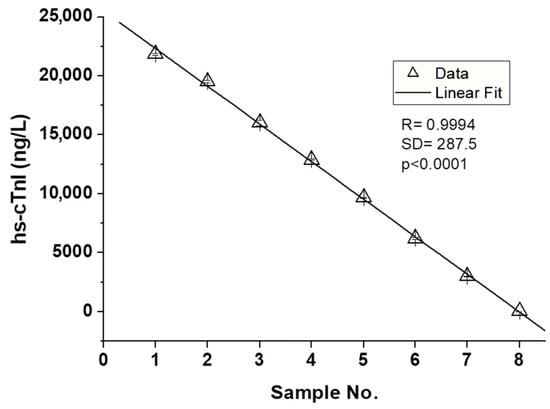 These results highlight the cTnI assay’s high reproducibility, particularly within clinically significant concentration ranges. Linear measurements further validated the assay performance. This indicates that the test provides accurate and proportional responses to varying troponin concentrations, ensuring reliable, even stricter quantification in diverse clinical scenarios, such as the emergency department, and avoiding misclassification [5,13,35,36].