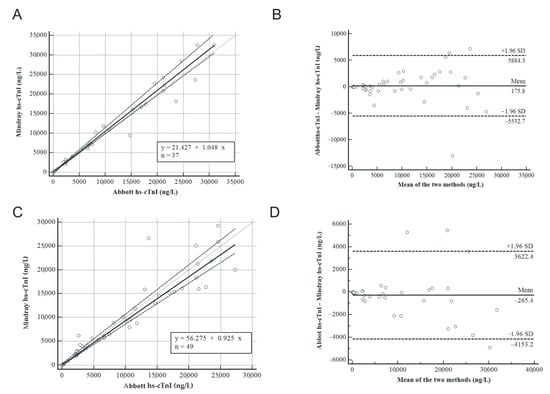 Serum or plasma samples were collected from residual routine specimens of patients admitted to the emergency department with chest pain symptoms or acute coronary syndrome. A total of 49 lithium heparin plasma and 37 serum samples were used for the comparison of cTnI assay between Alinity-i (Abbott, Abbott Park, IL, USA) and CL-2600i (Mindray, Shenzhen, China) instruments. Samples were centrifuged at 2000× g for 10 min and then processed according to the manufacturer’s instructions.