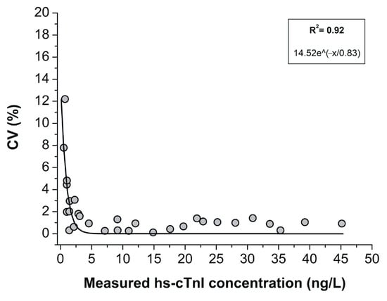 To calculate the hs-cTnI 99th percentile imprecision, the EP15-A3 protocol was followed [24]. The imprecision profile was plotted according to cTnI concentrations measured with corresponding CVs observed in a series of 30 samples, with hs-cTnI concentrations ranging between LoD values and 99th percentile URLs.