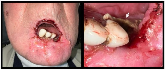 Exposed necrotic bone of the jaws (ENB) occurs in patients with disrupted bone homeostasis, causing bone destruction, loss of oral functions, and impairment of their quality of life (QoL) [1]. Indeed, patients with ENB report pain, halitosis, and dysgeusia as the most common symptoms; in addition, local or systemic infections, intraoral or extraoral fistulas, trismus, numb chin syndrome, and pathological fractures occur in advanced cases [2,3]. The medical history of patients showing ENB can involve single or multiple concurring potential etiologic agents, such as ionizing radiation therapy, anti-resorptive drug treatment, bone inflammation, and local or distant malignancies causing bone destruction [1]. However, the differential diagnosis of the primary disease causing ENB is challenging because of the overlapping clinical and radiological appearance of such clinical conditions, and several authors suggest that histological examination should be mandatory for all osteolytic lesions and that malignancy suspicion should always be high [2,4,5]. The current literature recognizes several diseases that can lead to ENB and require targeted treatment approaches, such as medication-related osteonecrosis of the jaw (MRONJ), osteoradionecrosis (ORN), and squamous cell carcinoma (SCC) [1,4,6,7,8]. MRONJ is an infective complication of anti-resorptive therapies and has a progressive course; therefore, the treatment involves antibiotics and surgical bone resection [9]. ORN needs conservative nonsurgical treatment and shows an indication for antibiotic therapy in cases of bacterial over-infection; only patients carrying large areas of exposed bone undergo surgery [10]. Cutaneous SCC requires surgery or radiotherapy in >95% of patients; the remaining <5% show metastatic or locally advanced cutaneous SCC, which is not eligible for surgery or radiotherapy and undergoes chemotherapy [11]. Therefore, differential diagnosis among the diseases causing ENB is pivotal for treatment and prognosis. The current guidelines of the American Association of Oral and Maxillofacial Surgeons (AAOMS) established the three diagnostic criteria for MRONJ [7]: first, current or previous treatment with antiresorptive therapy alone or in combination with immune modulators or antiangiogenic medications; second, exposed bone or bone that can be probed through an intraoral or extraoral fistula(e) in the maxillofacial region that has persisted for more than eight weeks; third, no history of radiation therapy to the jaws or metastatic disease in the jaws [7]. The radiographic findings of MRONJ include bone sequestrations, lytic changes, sclerosis, thickening of the lamina dura, and periosteal bone formation [4]. An ORN diagnosis occurs in cases of the development of ENB at least six months after the end of radiotherapy; in addition, the radiologic features of ORN involve erosive changes and sequestrations [4]. SCC destroys the jawbone by showing invasive or erosive patterns; the invasive pattern shows cancer penetrating the cortical bone without the interposition of connective tissue; therefore, tumoral islands grow into cancellous spaces [8]. The erosive pattern shows a connective tissue layer separating the cancer from the bone; therefore, the tumor erodes the cortical bone without growing into cancellous spaces [8]. The current case report aims to show the diagnostic challenge of mandibular ENB in a patient with locally aggressive cutaneous squamous cell carcinoma of the lower lip and carrying risk factors for osteoradionecrosis and medication-related osteonecrosis of the jaws.