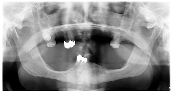 In March 2023, an 80-year-old ex-farmer male patient came to the Odontostomatology Unit of the “Aldo Moro” University of Bari (Italy) due to feeding difficulty. The cause of the patient’s main complaint was pain in the lower right incisors and the canine during chewing; these teeth showed grade III mobility. The patient showed an incompetent labial seal because of the anterior inclination of these teeth. The patient had microstomia and several ulcers on the lower lip. In addition, the patient showed a painful 3 cm area of ENB in the left region of the mandible (Figure 1 and Figure 2).