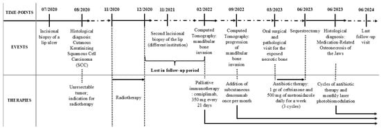 A summary of the patient’s recent medical history. In the middle row, the timeline shows the diagnostic procedures and the events that occurred from the first incisional biopsy of the lip to the last follow-up; in the lower row, the figure shows all therapies the patient received.