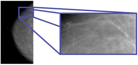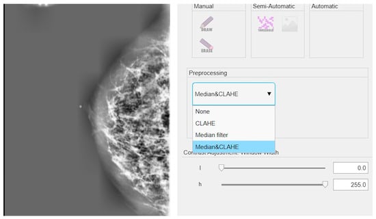 The results discussed in this section are based on the cascade application of the CLAHE method and the median filter. An example of the implementation of these techniques on a mammographic image is shown in Figure 3.