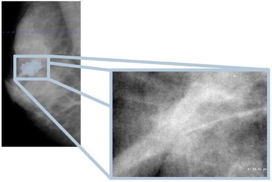 In this study, the database used is the CBIS-DDSM, which contains mammographic images representative of the two types of lesions (masses and calcifications) accompanied by appropriate ROI masks, identifying the lesions. In particular, with regard to calcifications, those masks that did not represent the lesion, for example, those that covered the entire breast, were excluded from the study. In Figure 1, an example of a mammographic image containing a microcalcification accompanied by its ROI mask and its cropped image is shown, while in Figure 2, there is a similar example but with an image containing a mass.