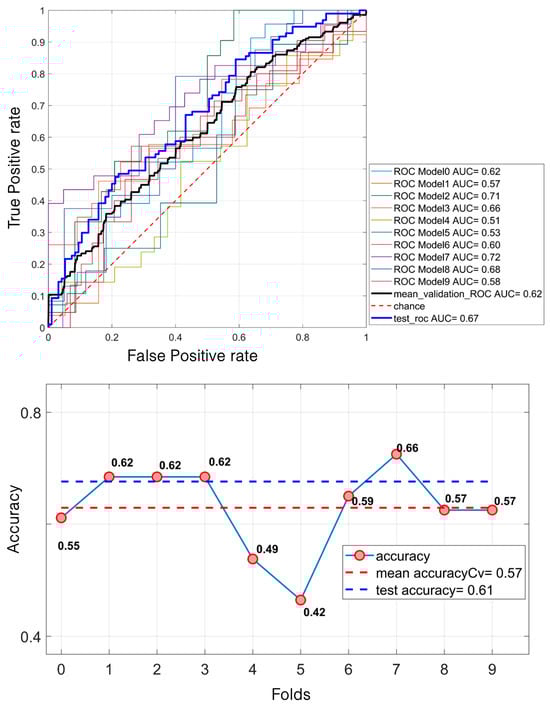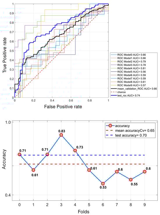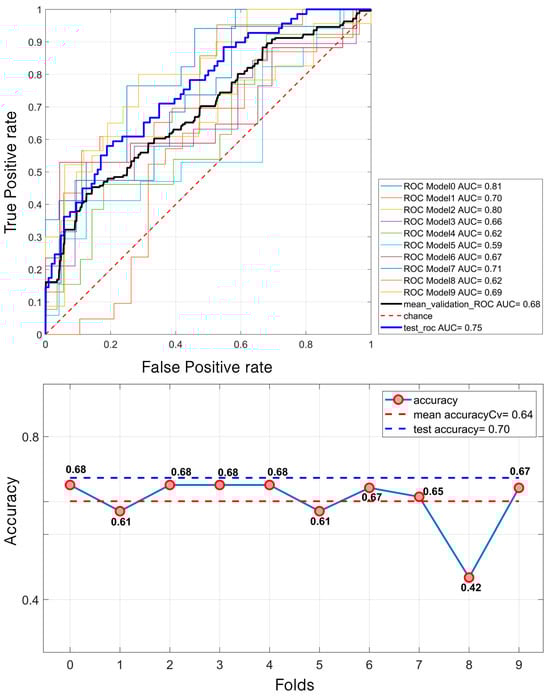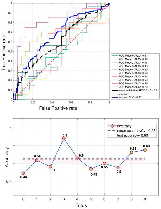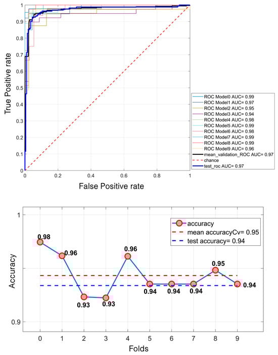 The results presented in Table 1 highlight the strong differentiation capability of the LDA model, while Figure 4 illustrates the corresponding ROC curve (up) and accuracy metrics (down), further validating the model’s performance. Indeed, regarding the differentiation phase, the model achieved high performance in both the validation and test sets. The mean ROC AUC reached 97.42%, with a test ROC AUC of 97.08%. The accuracy was similarly high, with 95% during the validation and 94% on the test set.