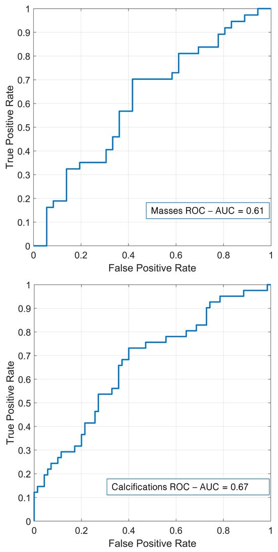 The final step in a radiomics analysis is assessing the trained model’s performance in classifying mammographic lesions. In this study, two metrics are examined: the Area Under the Curve (AUC) of the Receiver Operator Characteristic (ROC) curve and accuracy. These metrics are widely used in medical applications as they provide complementary insights into the classifier’s ability to distinguish between classes and make reliable predictions.