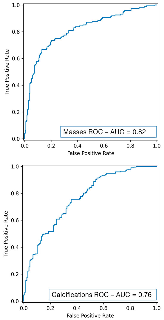 The EfficientNetB6 network was pre-trained on the ImageNet dataset to leverage optimized weights, enhancing generalization on smaller datasets. The adaptation process included two phases: transfer learning and fine-tuning. The original classification head of the pre-trained model was replaced with a custom head that included fully connected layers. During this phase, only the new head was trained, while the weights of the convolutional layers were kept frozen to retain the knowledge acquired during the pre-training. In the fine-tuning phase, the entire model was refined. All weights, including those in the convolutional layers, were updated, allowing the model to adapt to the specific task while preserving the valuable features learned during the initial pre-training. In the case of mass classifications, the head was replaced with a Global Average Pooling operation, followed by a Dense Layer of 1024 neurons and a RELU activation function, a Dropout layer (percentage = 0.3), and a final Dense Layer of 1 neuron and a Sigmoid activation function, while, for calcification classifications, the head was replaced with a Global Average Pooling operation, followed by a Dense Layer of 256 neurons and a RELU activation function, a Dropout layer (percentage = 0.3), and a final Dense Layer of 1 neuron and a Sigmoid activation function. This is the configuration that maximizes the Area Under Curve metric on the validation set during training. For both calcification and mass classifications, the number of neurons tested in the Dense Layer ranged from 256 to 1024.