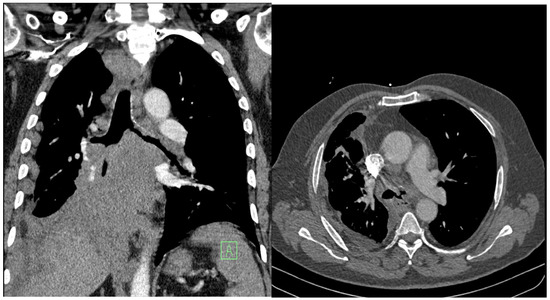 Clinically, exertional dyspnea dominated, which had worsened over the previous few days, as well as a cough, general weakness, fatigue, and a loss of appetite. In the physical examination, the patient had an oxygen saturation on pulse oximetry of 88%, was normotensive, without tachycardia, and had a BMI of 32 kg·m−2. His breathing was weakened basally on both sides, without secondary phenomena. The laboratory examination excluded inflammatory etiology. Complementary CT-angio scanning ruled out pulmonary embolism but showed the progression of a tumorous mass under the right hilum, with compression of both main bronchi and growth of the tumor into the left main bronchus (Figure 3).